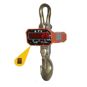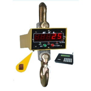 電子吊秤的吊環掛在起重機的吊鉤上,當電子吊秤的吊鉤上掛上物品后,在秤體內的傳感器受到拉力產生變形,傳感器內的電流發生變化,然后這個變化的電流通過A/D轉換,再通過發射機將無線電信號發出,根據國家無線電管理委員會的規定,電子吊秤一般是用230MHZ和450MHZ發出的,接收機接收到信號以后傳輸給儀表,然后經過儀表的轉換計算,最終顯示出來。